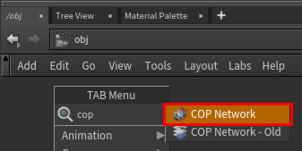 ①ネットワークビューの obj 階層で「Tabキー」を押し【cop】と入力すると「COP Network」という項目が出てくるのでそれを選びます。(obj だけではなくgeo ノードの中や img / out 階層内でも作れます)