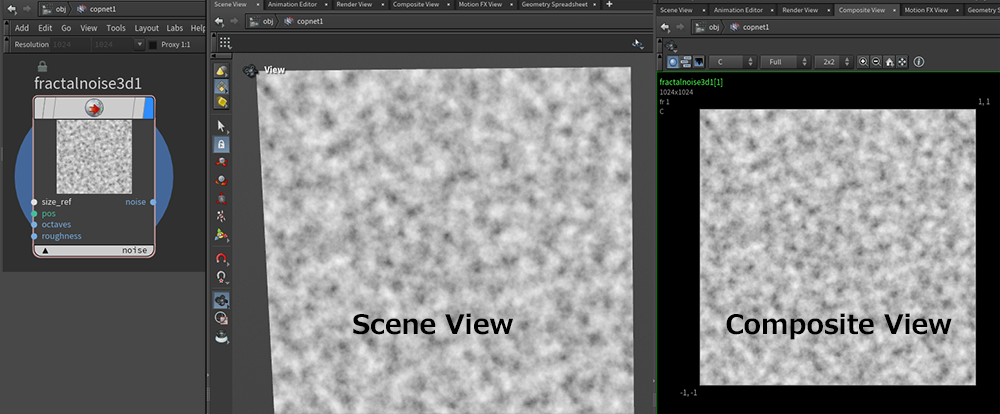 ②cop net が作られるのでその中に入り「Tabキー」を押し【 fractal noise 】を入力するとすると以下の様に fractal noise ノードが作られ同時に Scene View , Composite View に反映されます。
