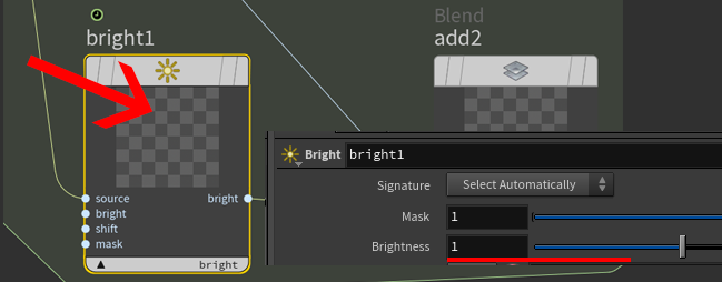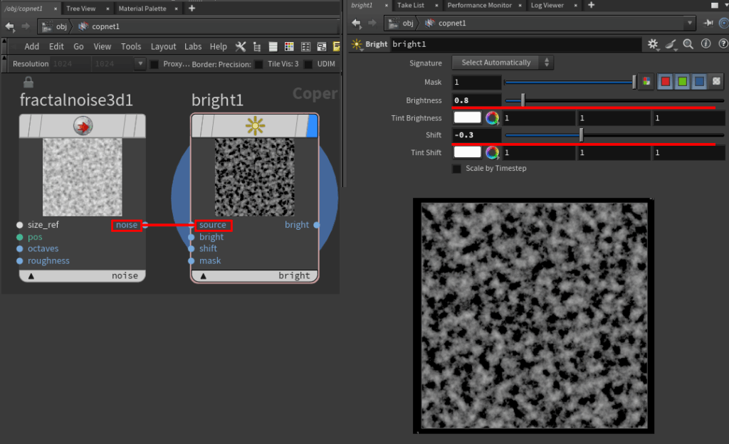 ③再度「Tabキー」を押し、今度は【 bright 】ノードを追加します。先ほど作った fractal noise の出力にある「noise」をマウスドラッグすると線が伸びるので、それを bright ノードの入力にある「source」に接続します。次にこの ノードを選択すると parameters ウィンドウに該当ノードのパラメーターが表示されるので変更しディスプレイフラグを入れると変更された結果を確認する事が出来ます。