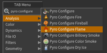 Cop Pyro が複雑なノード構成になっているので、慣れるまではHoudini に予め登録されているプリセットを使う事をおススメします。こちらは「Tabキー」を押し【 pyro configure 】と入力すると出てきます。