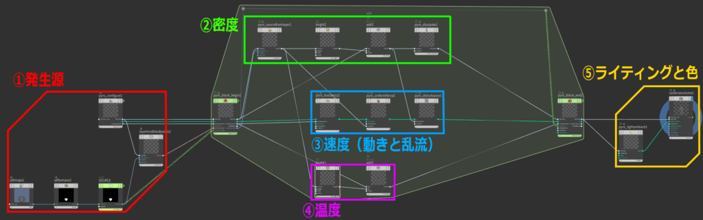 ⑤ライティングと色—– 炎や煙等の色や濃さを調整、また煙に対してライティングをするグループ。それ以外に描画するカメラを設定する事が出来ます。