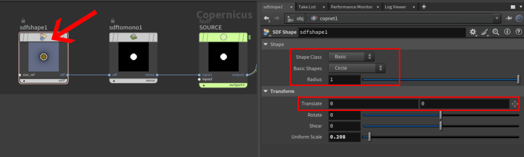 ではまず発生源の元になっているノード【sdfshape】を編集していきます。プリセットだとハートになっているので Shape Class を Basic にして Basic Shapes を Circle にします。 次に、Radius(半径)を1にして Translate の値を0にして原点位置にします。
