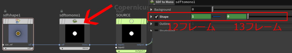 また現状だと常に発生源が表示され煙が出続けている状態になっている為、その次にある【sdftomono】にある Shape に12フレームまでは1、13フレームで0になる様にキーアニメーションを設定します。