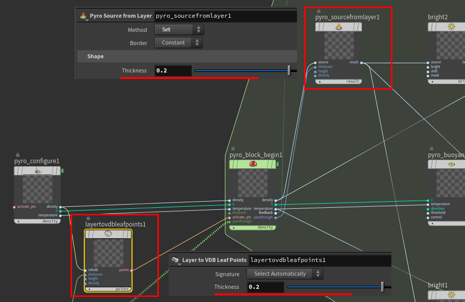 次に煙に厚みを付けたいので【pyro_sourcefromlayer】【layertovdbleafpoint】にある Thicknessを0.2に増やします。こうする事により奥に厚みが出るので発生範囲が広くなります。