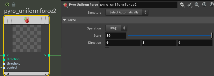 発生源の調整が出来たので次は速度回りを調整していきます。③速度(動きと乱流)グループにある【pyro_unifromforce】で単一の動きが設定されているのですが、現状だと+Yに値が打たれている為、上方向に煙が動いてしまってます。