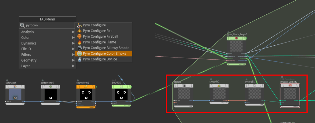 これだと意図した動きにならないので、Scale を5にして、Directionを全て0にしておきます。動きとしては放射状に広がる動きになって欲しいのでノードで方向を作っていきます。1から構築していってもいいのですが、他のプリセットからノードを移してこようと思います。 作業中のノード群と混在しない様にもう一つcop ノードを作りその中でプリセット【Pyro Configure Color Smoke 】を作り、以下赤枠内にある4つのノードをコピーして作業中の方ににペーストします。(コピーしたノード:ramp , slopedir , uvtorgb , inward_velocity)