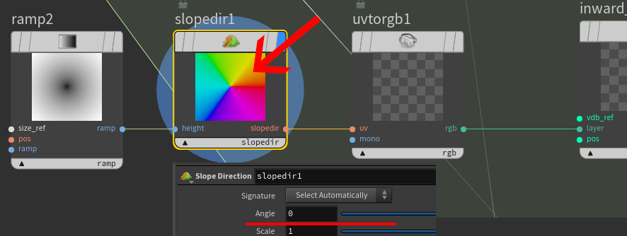 移してきたノード群を調整していきます。まず【slopedir】の Angle が180になっているのでこれを0にします。