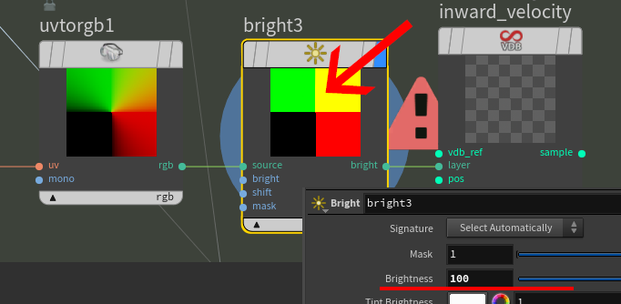 次に強度調整用に【bright】ノードを 【uvtorgb】と【inward_velocity】ノードの間に入れ、Brightness の値を100にします。