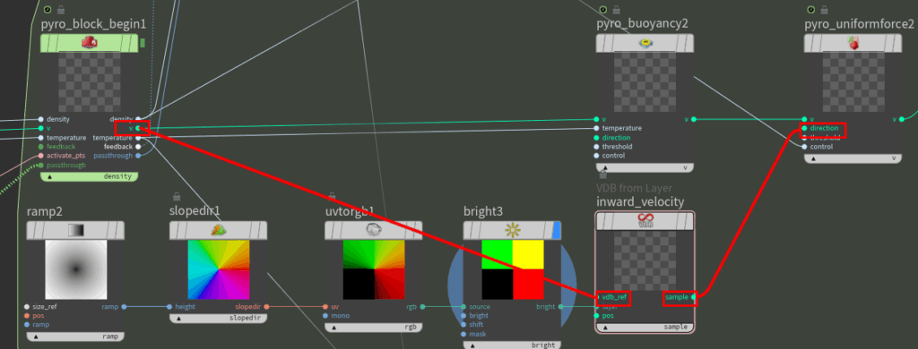 まだ本流のノードと接続されてない為、接続していきます。【pyro_block_begin】のアウトプット「v」を【inward_velocity】のインプット「vdb_ref」に繋ぎます。また、このノードのアウトプット「sample」を【pyro_uniformforce】のインプット「direction」に接続します。