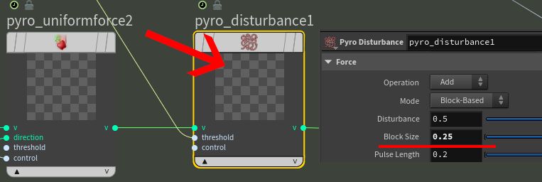 ベースの動きが出来たのでここからは細かい動きの調整をしていきます。まずは、pyro_uuniformforce ノードの横にある【pyro_disturblance】を編集していきます。ここでは乱流(空気のうねり)を制御しておりこの中の「Block Size」を 0.25に変更します。