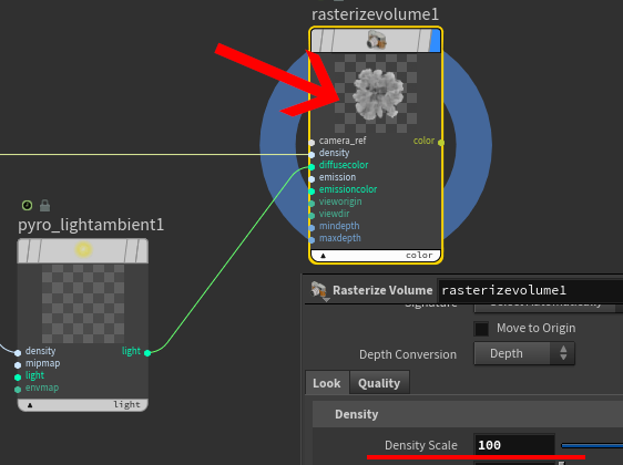 あとは出力する位なのですが、煙が少し薄いので最後にあるノード【rasterizevolume】の「Density Scale 」を100に増やします。