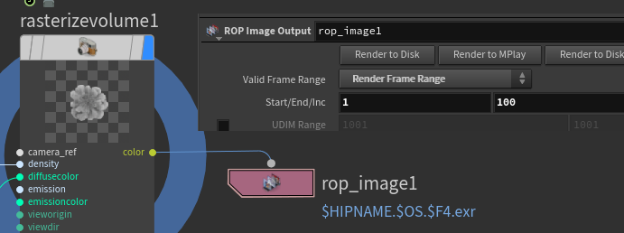 シーケンス画像をゲームエンジンに持ってくる場合、スプライトシートという連番を1枚の画像に合成したものを出力する必要がありますので、一度シーケンスとして出力します。rasterizevolume ノードの後に【ROP Image Output 】ノードを作り繋げ出力します。