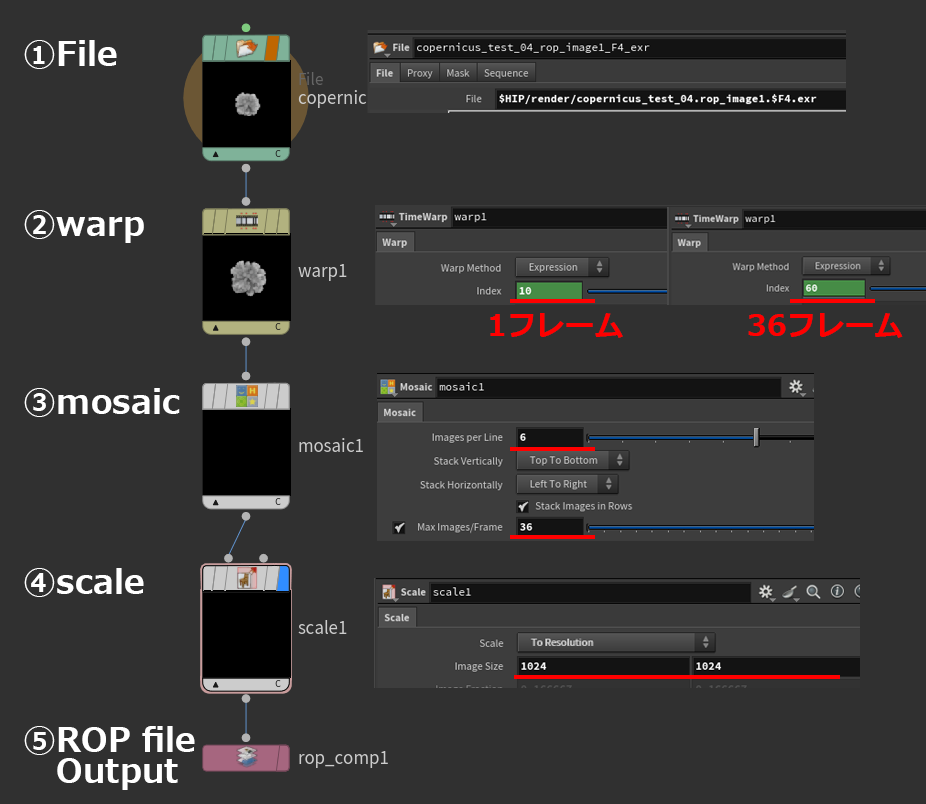 ⑤ROP file Output ノード — 画像を出力するノードです。