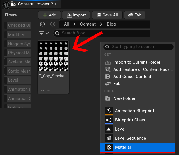 コンテンツブラウザからテクスチャをインポートして右クリックから「Material」を選択しアセットを作成します。