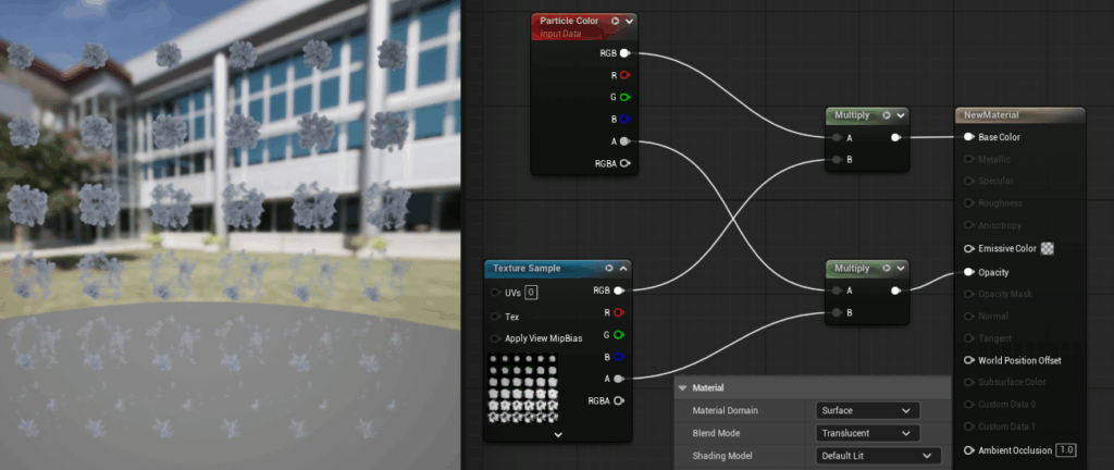 Blend Mode を「Translucent」に変更し以下の様に「Texture Sample」ノードと「Particle Color 」ノードを作成し「Multipy」で掛け算後 Base Color と Opacity に繋げています。