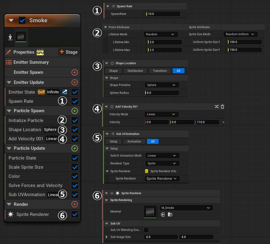 今回は1つ1つのモジュールについては今回割愛させて頂きますが、スプライトシートをNiagara で扱う為には分割数と枚数送りが必要になりますので、⑤Sub UV Animation モジュールで枚数送りの設定、⑥Sprite Renderer にある「Sub Image Size 」で分割数を設定しています。