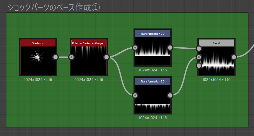 得たい結果次第の調整にはなりますが、今回は外側に向くショックパーツを作成したいので「Transformation 2D」で回転、横軸のタイリングを増やしています。