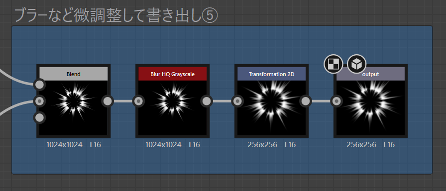 ③と④の結果を「Blend」で合成し、画像端の模様が見えないようにマスクをしてから「BlurHQGrayscale」でブラーをかけます。