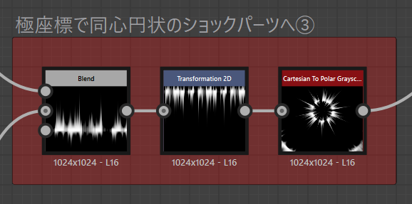「Cartesian To Polar」ノード繋げて同心円状のショックパーツの結果を得られました。
