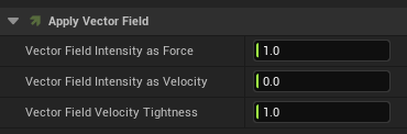 | Vector Field Intensity Tightness | Vector Field にどれだけ“忠実に”従うかを決める値。 0 :ゆるく従う(初速だけ従うような状態) 1 :完全に従う(しっかり流れに沿う) |
