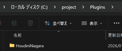 バージョン毎に管理さているのですが、今回はHoudini Niagara Plugin v2.7.4 内にあるAsset 「HoudiniNiagara-v2.7.4-UE5.7-Win64.zip」をダウンロードして使用しています。解凍すると HoudiniNiagara というフォルダが出来るので、これをプロジェクト> Plugins 以下に格納します。