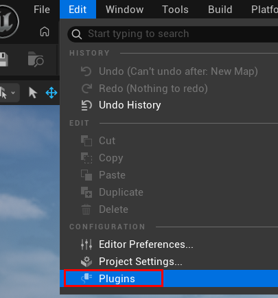 次に Unreal Engine 起動しプロジェクトを開き Edit > Plugins 設定を開きます。
