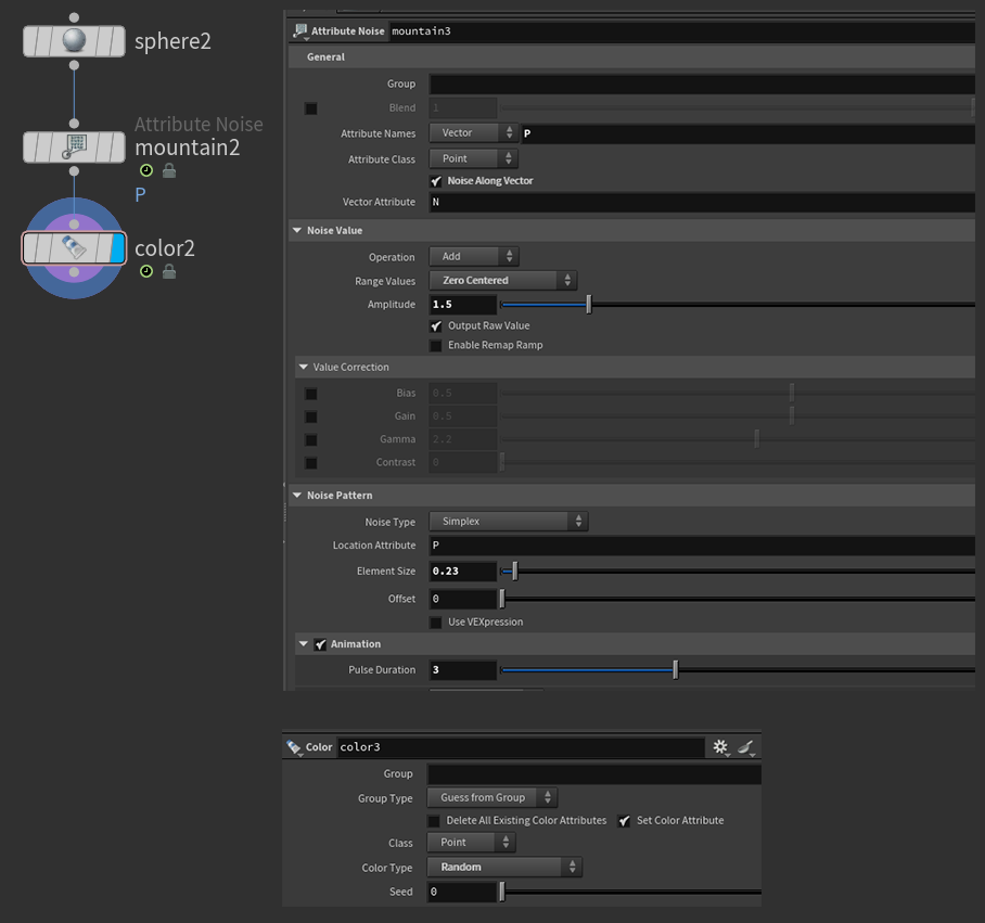 球体メッシュに対して Mountain SOP ノードを使い、下の動画の様にジグザグ動く形状にし Color ノードによりランダムなカラーを設定しました。