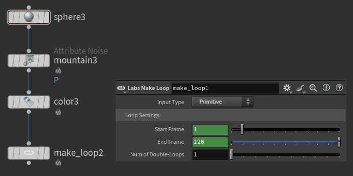 また今回は1~120フレームでループをさせたかったので Make Loop ノードでループしたアニメーションにしています。