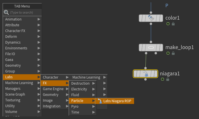 次に Tabs キーから FX > Particle > Labs Niagara ROP を選択して作成し、make loop ノードの下に繋げます。