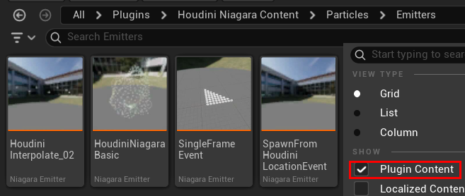 公式からいくつかプリセットのエミッターが提供されているので、この中にある 「Houdini Niagara Basic 」から進めても良いのですが、minimal から進めていきます。※表示されない場合「Plugin Content」をチェックしてみて下さい。