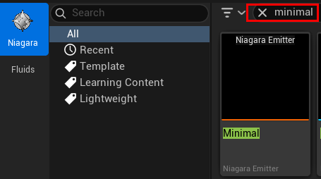 コンテンツブラウザ右クリック>FX>Niagara System を選択します。専用ブラウザが開くので検索欄に「minimal」と入力し出てきたエミッターを加えたものを作成します。