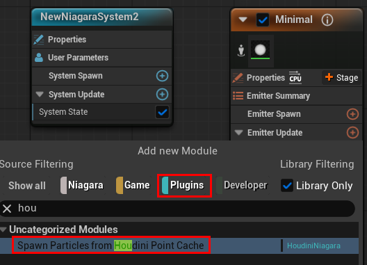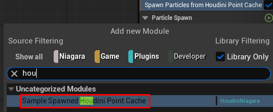 次に Emitter Update グループからプラス(+)ボタンを押し「 Spawn Particles from Houdini Point Cache 」モジュールを追加します。※Plugins にチェックが入ってないと見つからない為注意して下さい。