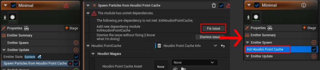参照関係でのエラーが出るのでその中にある「Fix issue」ボタンを押します。それによりEmitter Spawn グループに「Int Houdini Point Cache」モジュールが追加されてエラーが解消されます。