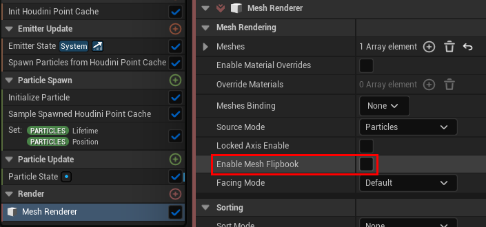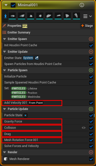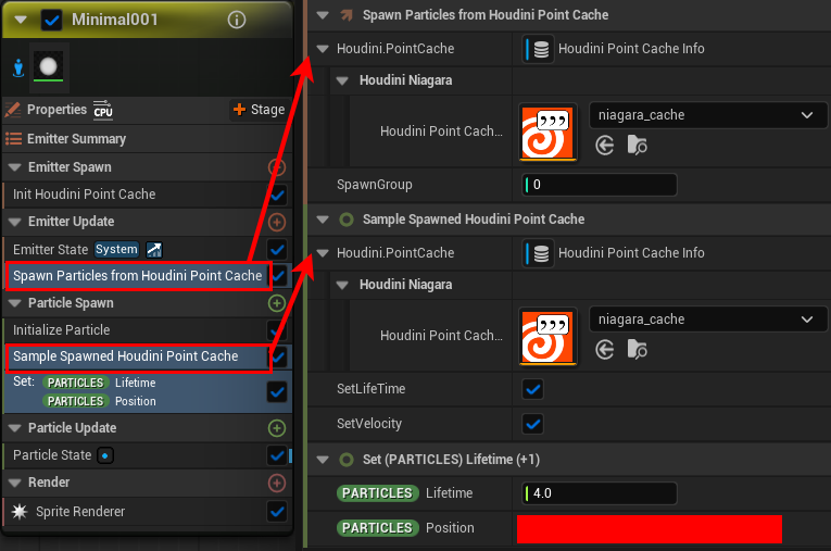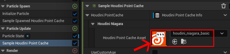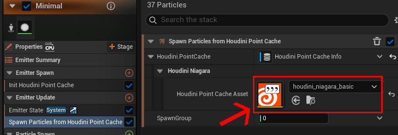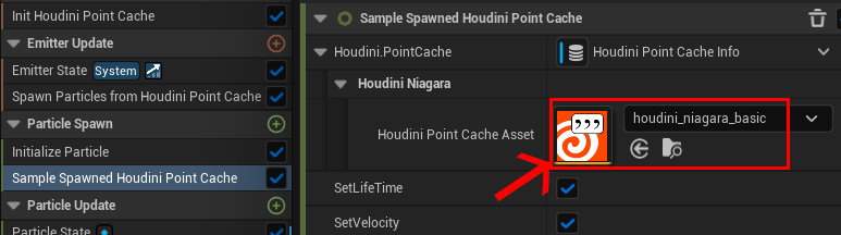 次に読み込んだキャッシュを Spawn Particles from Houdini Point Cache モジュール内にある Houdin Point Cache Asset に充てます。これによりキャッシュが読み込まれます。ちなみにここでは主にパーティクルの発生数やグループ等が読み込まれています。