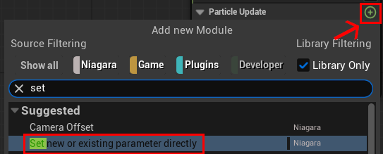 読み込んでいるキャッシュから変化している位置を取得したいので、Particle Update グループからプラス(+)ボタンで Set new or existing parameter directly を選択し、その中にあるプラス(+)ボタンから Potion (位置)パラメーターを追加します。