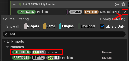 初期値だと 【ENGINE EMITTER Simulation Position】 が充たっているのですが、横にあるプルダウンボタン(∨)をクリックし検索ボックスから 【PARTICLE HOUDINI Position 】を見つけて選択します。 これによりパーティクル位置が動いているのが確認出来ると思います。ちなみに前に INITIAL と付いているものは初期値になります。また、Sample Houdini Point Cache モジュールの次に このモジュールが無いと情報が引き渡せないので順番にはご注意下さい。