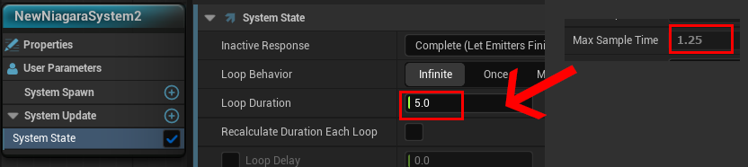 もし途中で思った通りの動きになってない場合は、エフェクト側でのループ尺に対して、キャッシュ側の尺が一致していないのが原因でキャッシュアセットを開いた時に Max Sample Time で確認出来るのでこれをエミッターやシステムの Loop Duration に一致させると直ります。