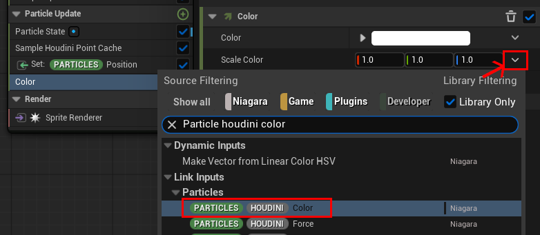 次にカラーを反映させていきますが、カラーに関しては Color モジュールを追加し Scale Color から【PARTICLE HOUDINI Color 】を充てれば反映されます。※時間による色変化が無いのであれば前に INITIAL と付いているものでも大丈夫です。