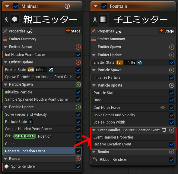 Houdini Niagara Plugin の強みの1つなのですが、キャッシュを受け取ってもパーティクルの為、Generate Location Event 等のイベントを親側で作成して子供に受け渡す事により、親の位置から発生させたりカラー等の親側の情報を子供に引き継げたりします。
