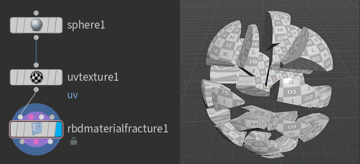 下図の様に球体モデルにUVを適用した後、RBD material fracture ノードで25個の破片モデルを作成しています。