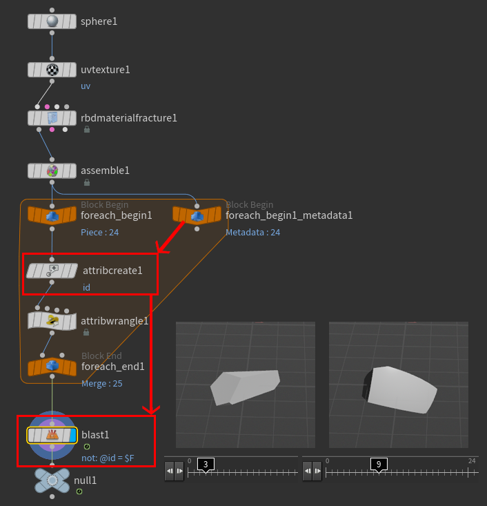 破片毎に個別のFBXデータとして出力する必要があるので、For Each を使い For Each Metadata にある iteration をIDに入れ、それを Blastノードでフレーム番号とイコール関係にする事によってタイムスライダーを動かすとそれぞれに関連する破片モデルが表示される様にしています。