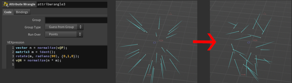 assemble ノードから Attribute Wrangle ノードを挿し、各位置からのベクターを算出後、rotate でY軸に対してラジアン90度回転させたものを法線(N)にする内容を書いています。