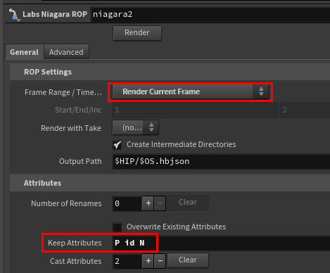 この Labs Niagara ROP ノードにある Renderボタンを押す事によりポイントキャッシュを出力する事が出来ます。※予めポイントに出力したいアトリビュートが入っているのが前提になります。
