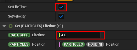また、注意したいのが Lifetime です。Sample Spawned Houdini Point Cache にある「Set Life Time 」のチェックを外す事で、Initialize Particle にある Life Time が通る認識でいたのですが、私の設定方法が悪いのかチェックの有無に関わらず通ってない為、Set new or existing parameter directly で Lifetime のパラメーターを作り値を入れ直しています。これについて何か分かりましたら別途ご報告いたします。