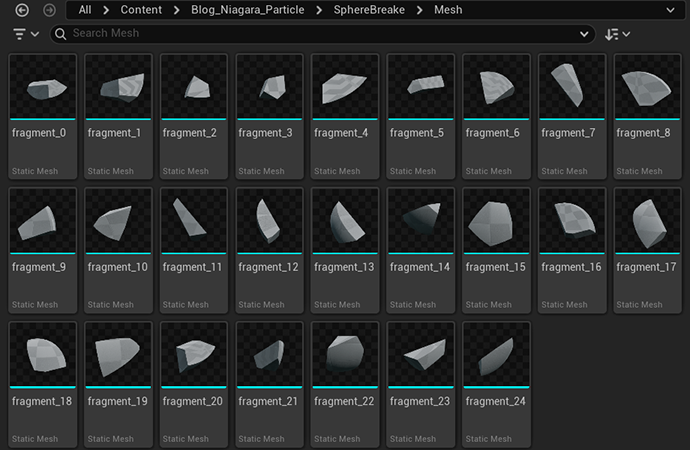 まず、コンテンツブラウザから破片メッシュを読み込みます。(破片の名前は fragment_0 ~ fragment_24 にしています)