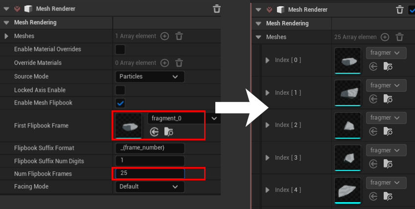 First Flipbook Frame に読み込んでいる破片メッシュで1番最初のアセット(作例だと fragment_0)を充て、Num Flipbook Frames にメッシュアセットの総数(作例だと25)を入れると Meshes に連番として全ての破片メッシュを充てる事が出来ます。