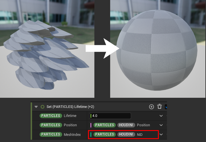 Houdini 側で出力した複数の破片メッシュをNiagaraに組み込み元々の形状である球体に構築していきます。