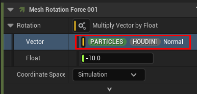 また、法線(N)としてキャッシュに持たせた初期回転値【PARTICLES HOUDINI Normal】を Mesh Rotation Force の Vector に充ててこの軸で回転する様にしています。